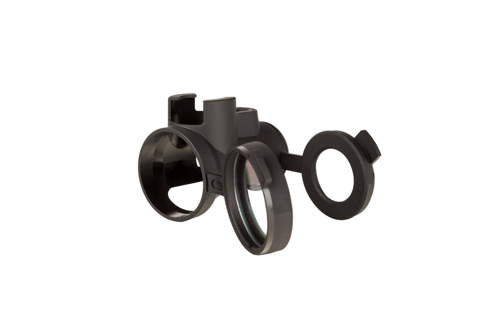 • Tapas Seguras: Las tapas de las lentes están diseñadas de manera única: se pueden plegar completamente y encajar de forma segura en su sitio. Esto evita que se muevan o golpeen la óptica durante el retroceso o que se enganchen accidentalmente con la maleza o el equipo.
